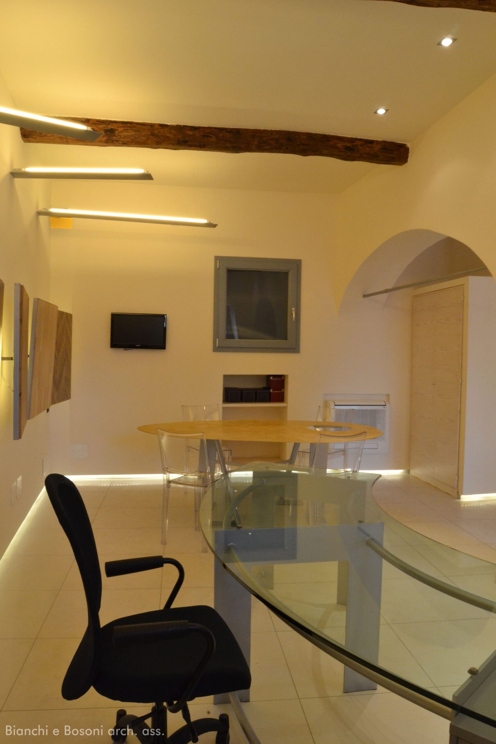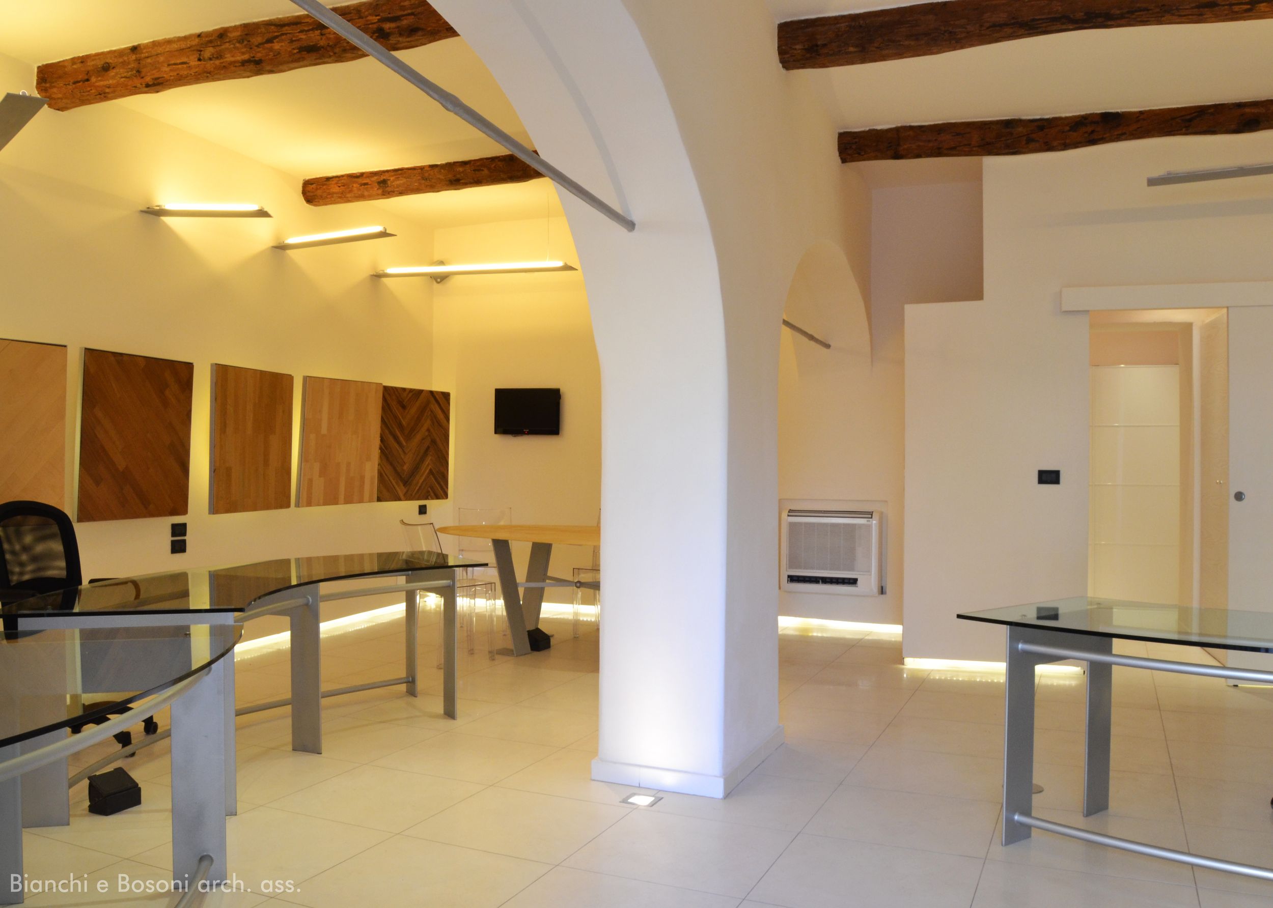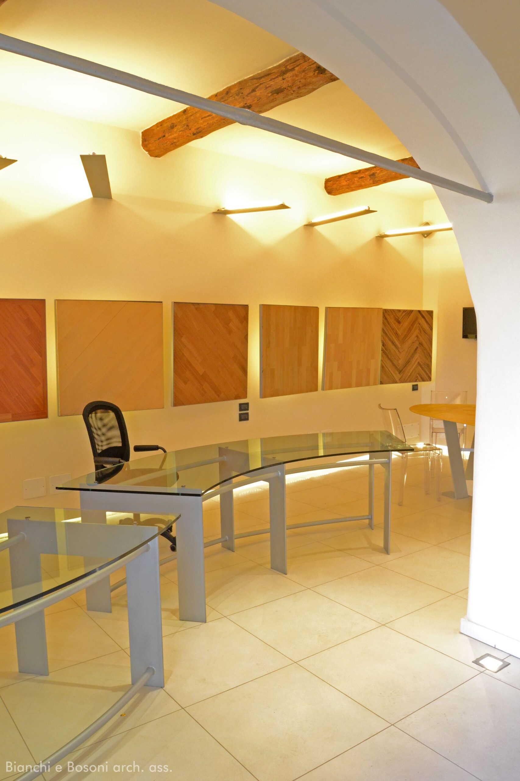 Intervento di cambio destinazione d’uso di un locale prima adibito ad officina. Sono state conservate e ricollocate sulle pareti del nuovo ambiente alcuni pannelli quadrati di diverse essenze di legno particolarmente care al cliente. I pannelli sono stati retro illuminati e non mantengono l’ortogonalità ne tra loro, ne rispetto alla parete – in modo tale da enfatizzare il senso di dinamicità del mercato immobiliare. Su questi ultimi vengono appese le inserzioni degli immobili in compravendita. La luce agisce sempre in maniera indiretta, abbiamo progettato le delle “mensole luminose” in metallo che che si protendono verso il centro del locale.