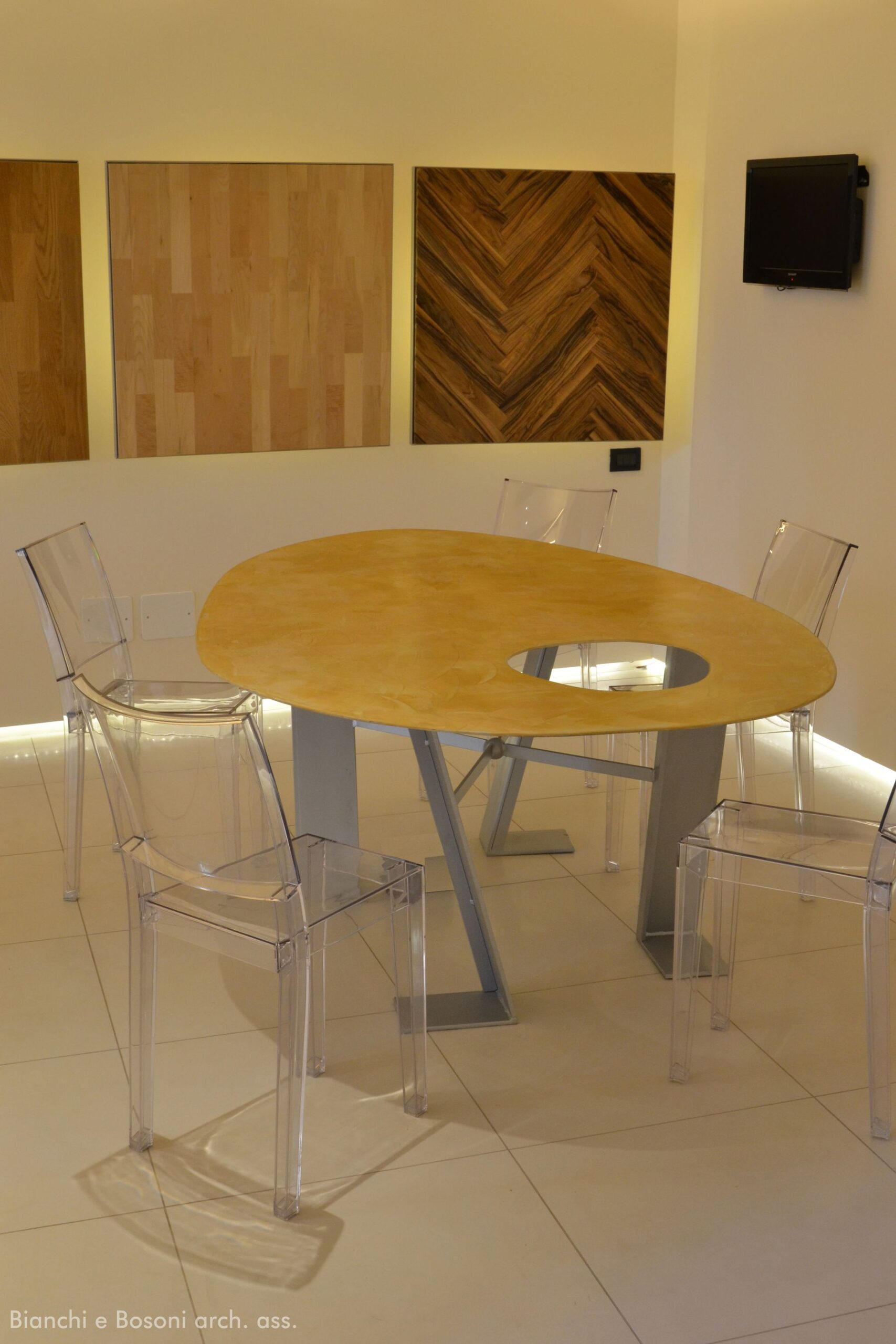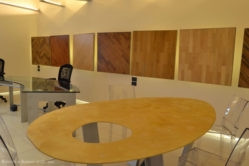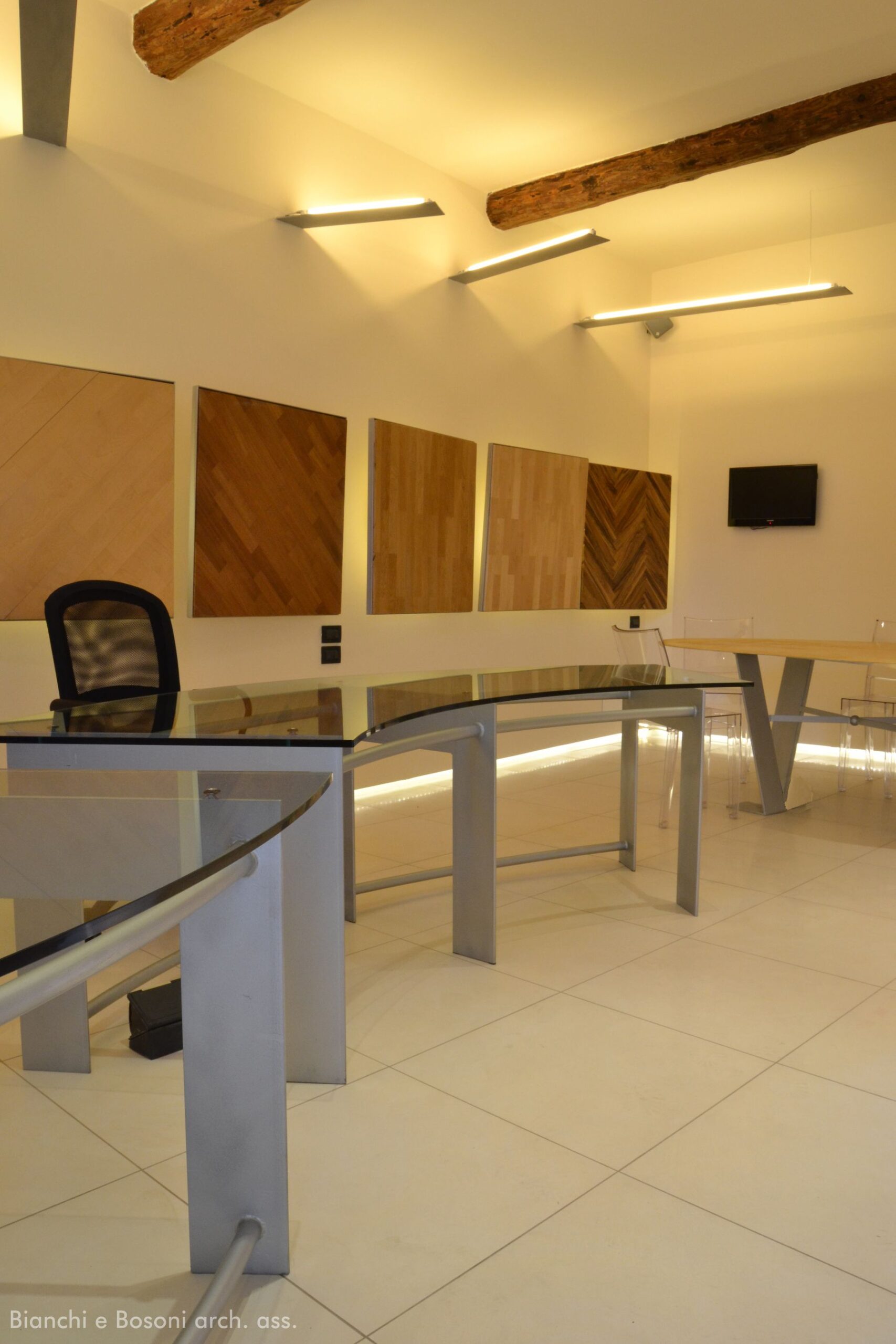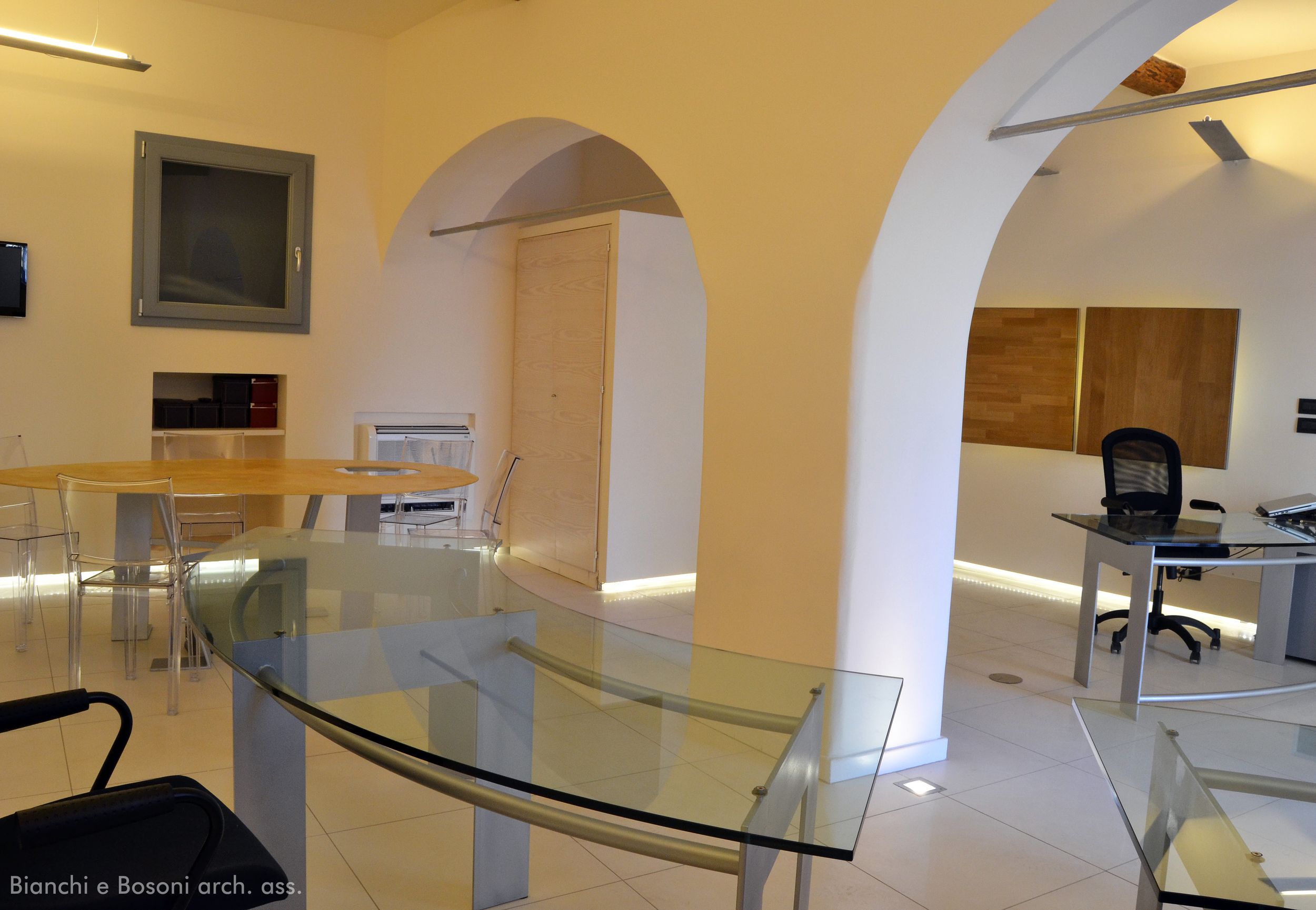 Intervento di cambio destinazione d’uso di un locale prima adibito ad officina. Sono state conservate e ricollocate sulle pareti del nuovo ambiente alcuni pannelli quadrati di diverse essenze di legno particolarmente care al cliente. I pannelli sono stati retro illuminati e non mantengono l’ortogonalità ne tra loro, ne rispetto alla parete – in modo tale da enfatizzare il senso di dinamicità del mercato immobiliare. Su questi ultimi vengono appese le inserzioni degli immobili in compravendita. La luce agisce sempre in maniera indiretta, abbiamo progettato le delle “mensole luminose” in metallo che che si protendono verso il centro del locale.