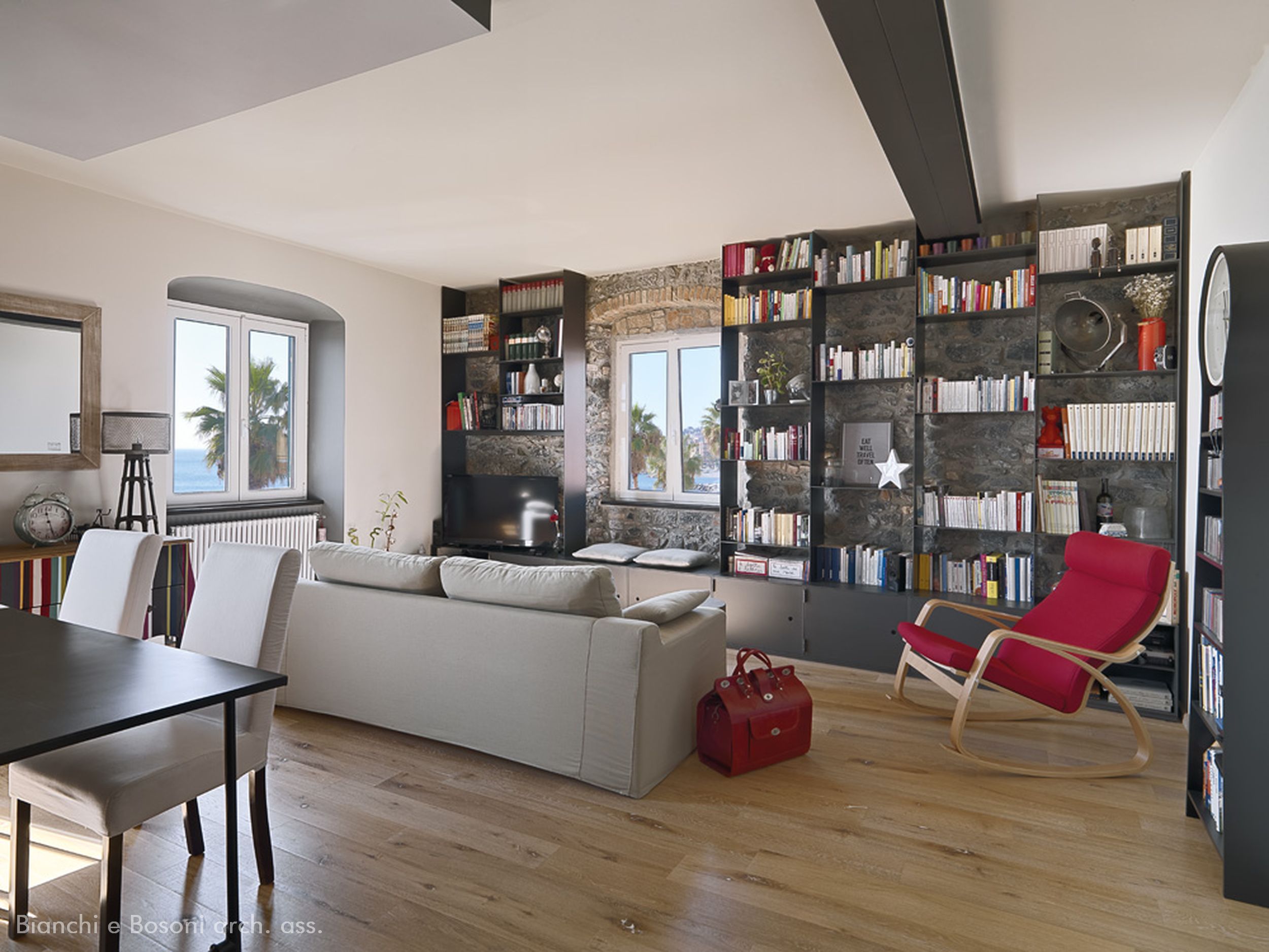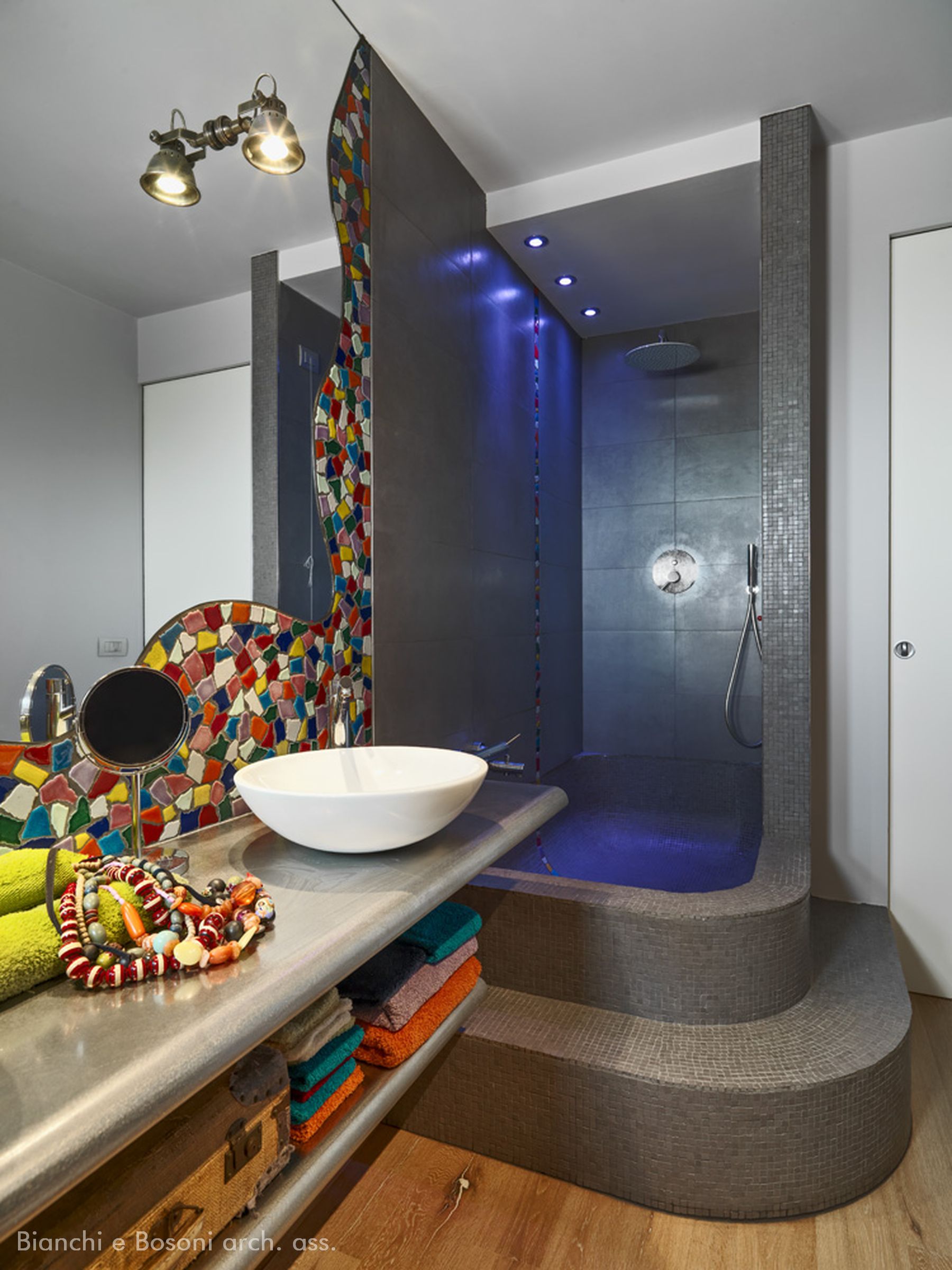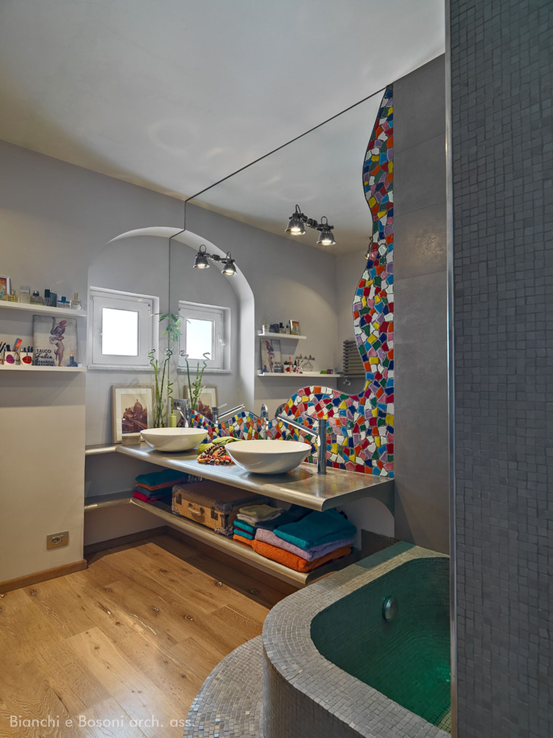 Arredi progettati dallo Studio Bianchi e Bosoni: Libreria in ferro su disegno verniciato – piano lavabo su disegno in acciaio spazzolato – specchio sagomato / Impianti: Condizionamento canalizzato / Illuminotecnica: Artemide , Maison Du Monde.