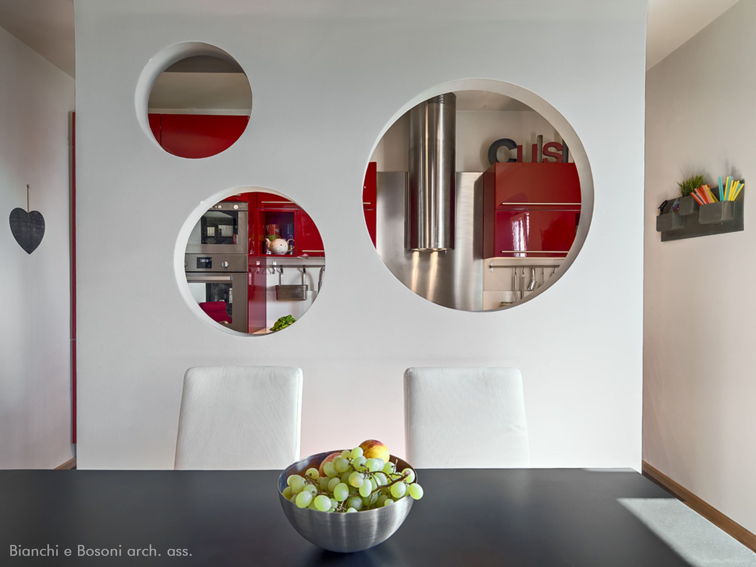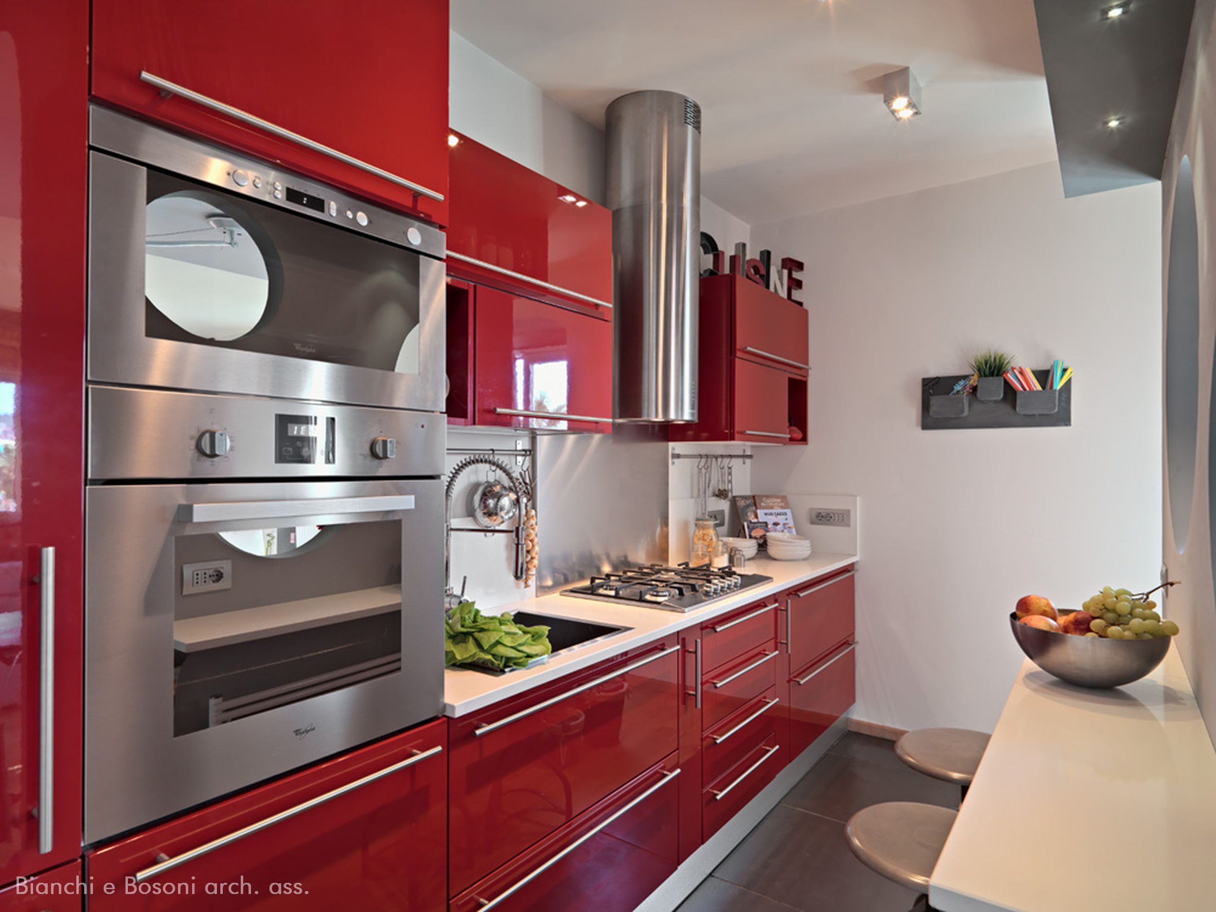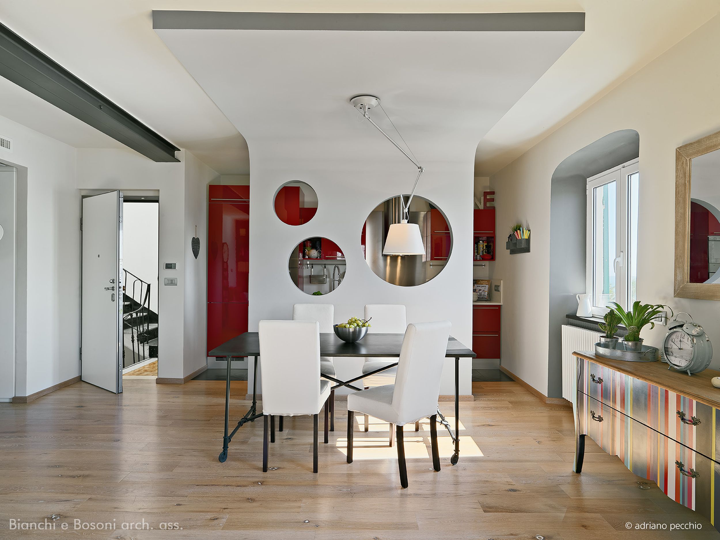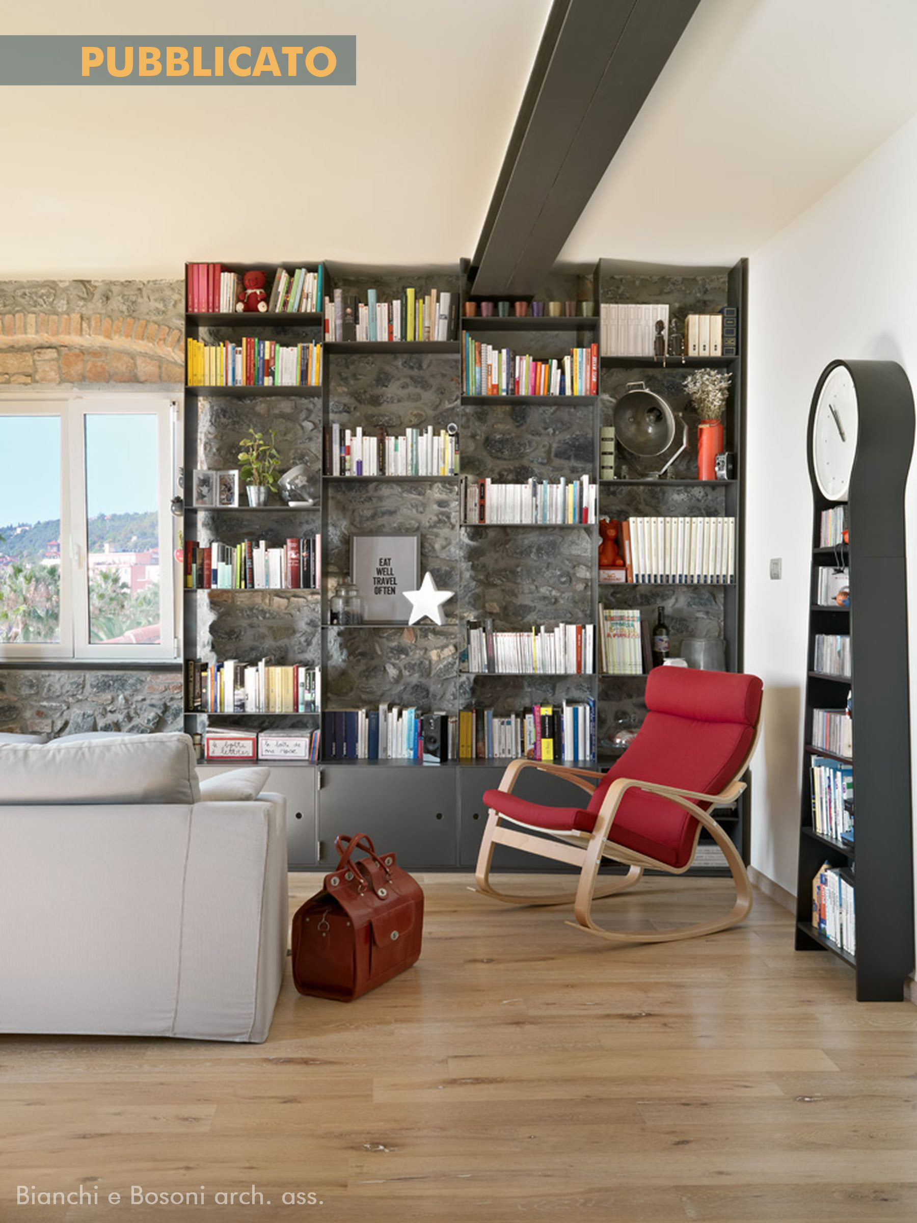 Arredi progettati dallo Studio Bianchi e Bosoni: Libreria in ferro su disegno verniciato – piano lavabo su disegno in acciaio spazzolato – specchio sagomato / Impianti: Condizionamento canalizzato / Illuminotecnica: Artemide , Maison Du Monde.