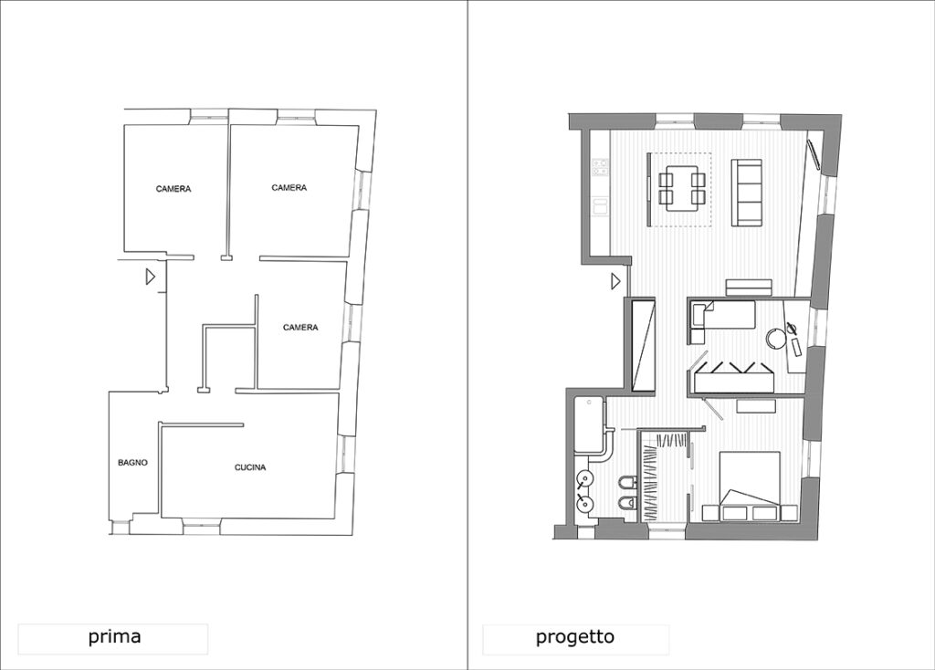 Intervento : Ristrutturazione interna / Supercie : 80 mq / Situazione Completato / Sintesi del lavoro: Modica della distribuzione interna e ottimizzazione degli spazi, attraverso la demolizione di tramezze e l’ampliamento della zona giorno. Valorizzazione degli affacci lato sud (vistamare ) e creazione di cabina armadio.