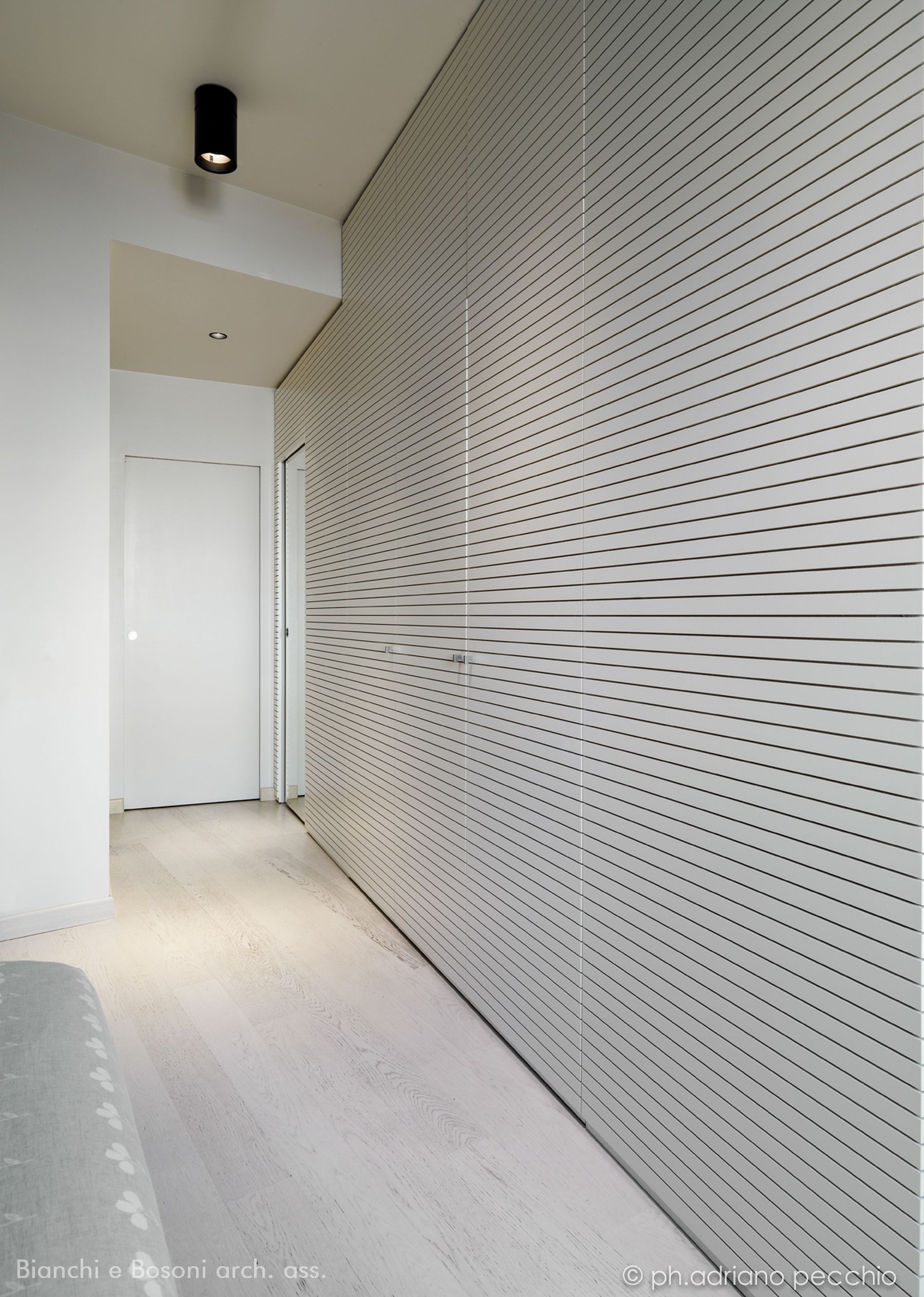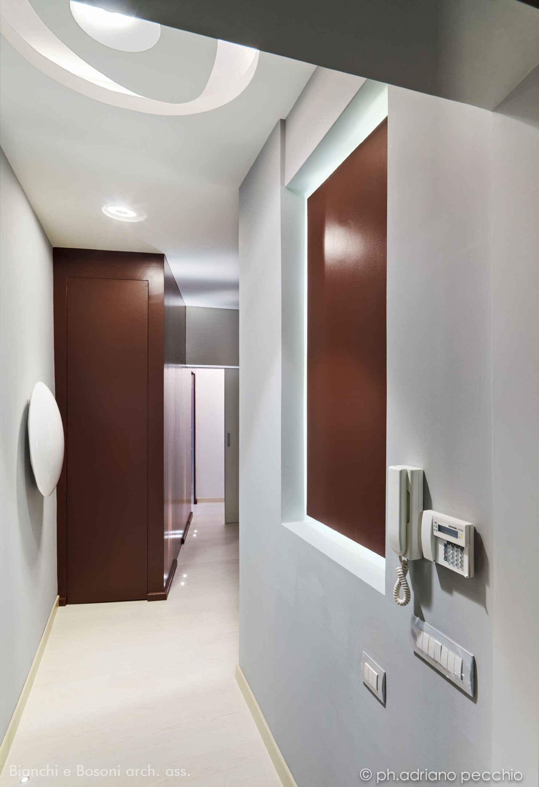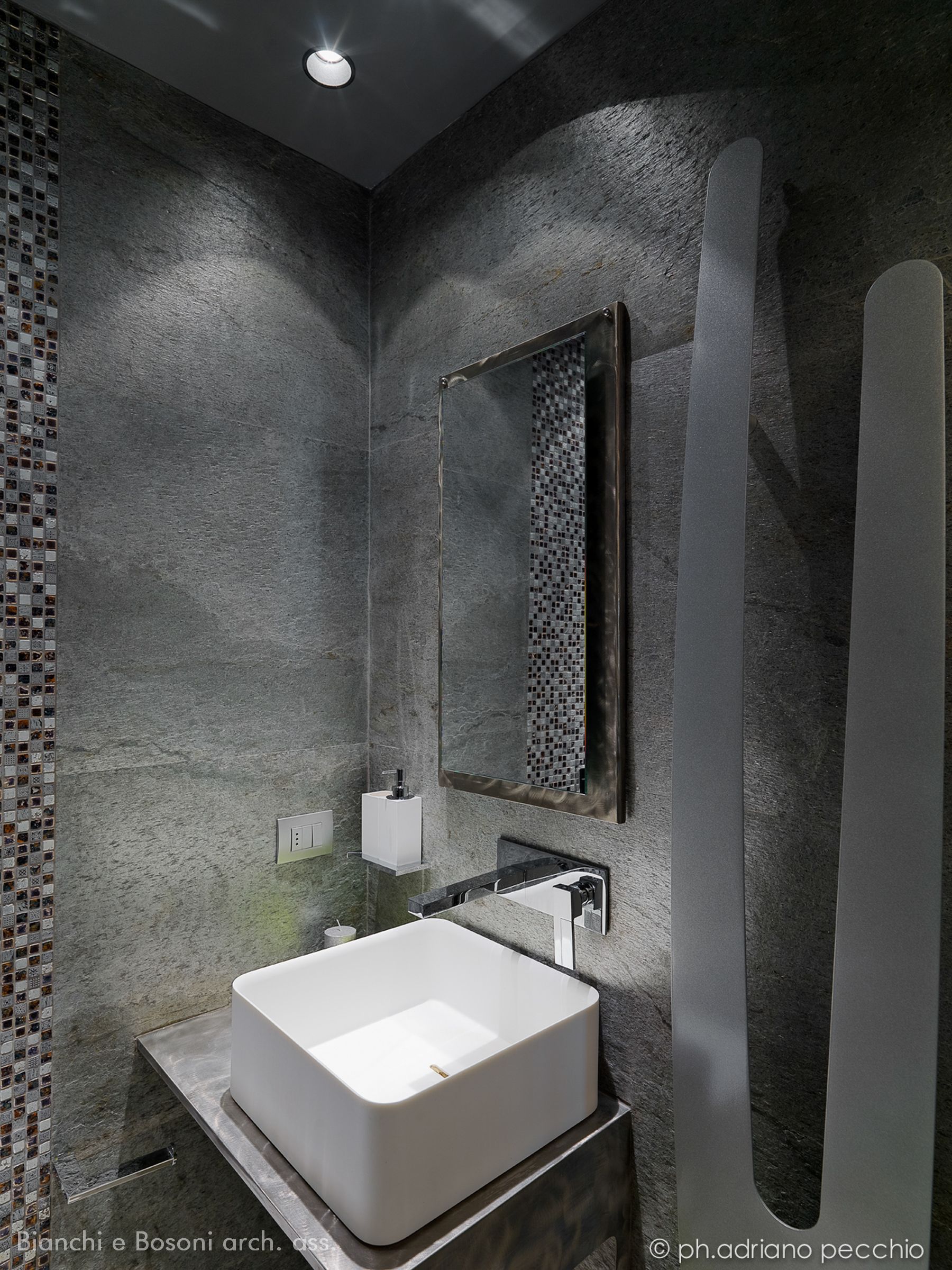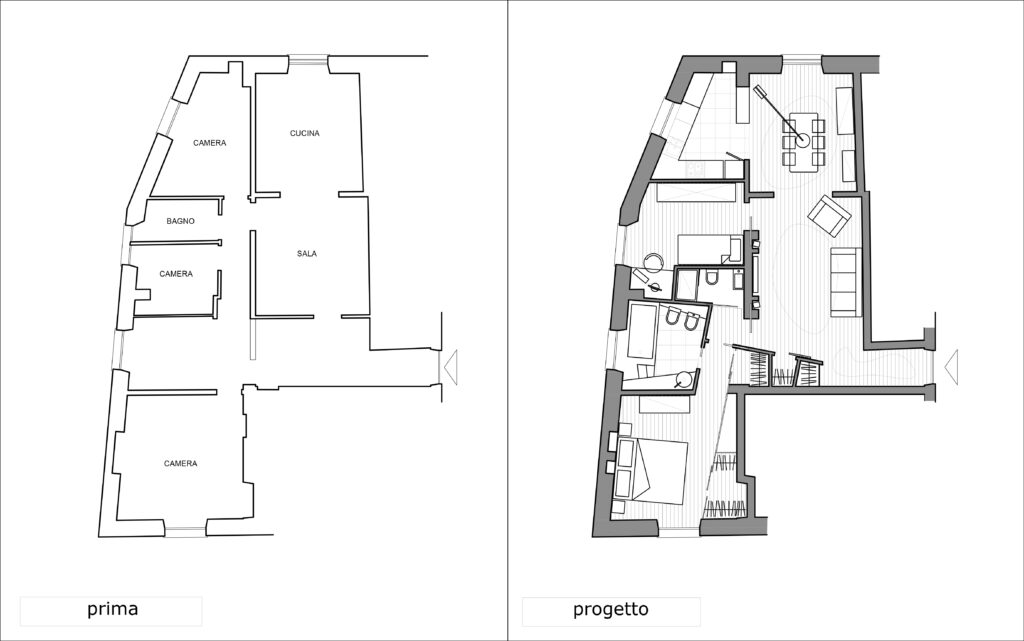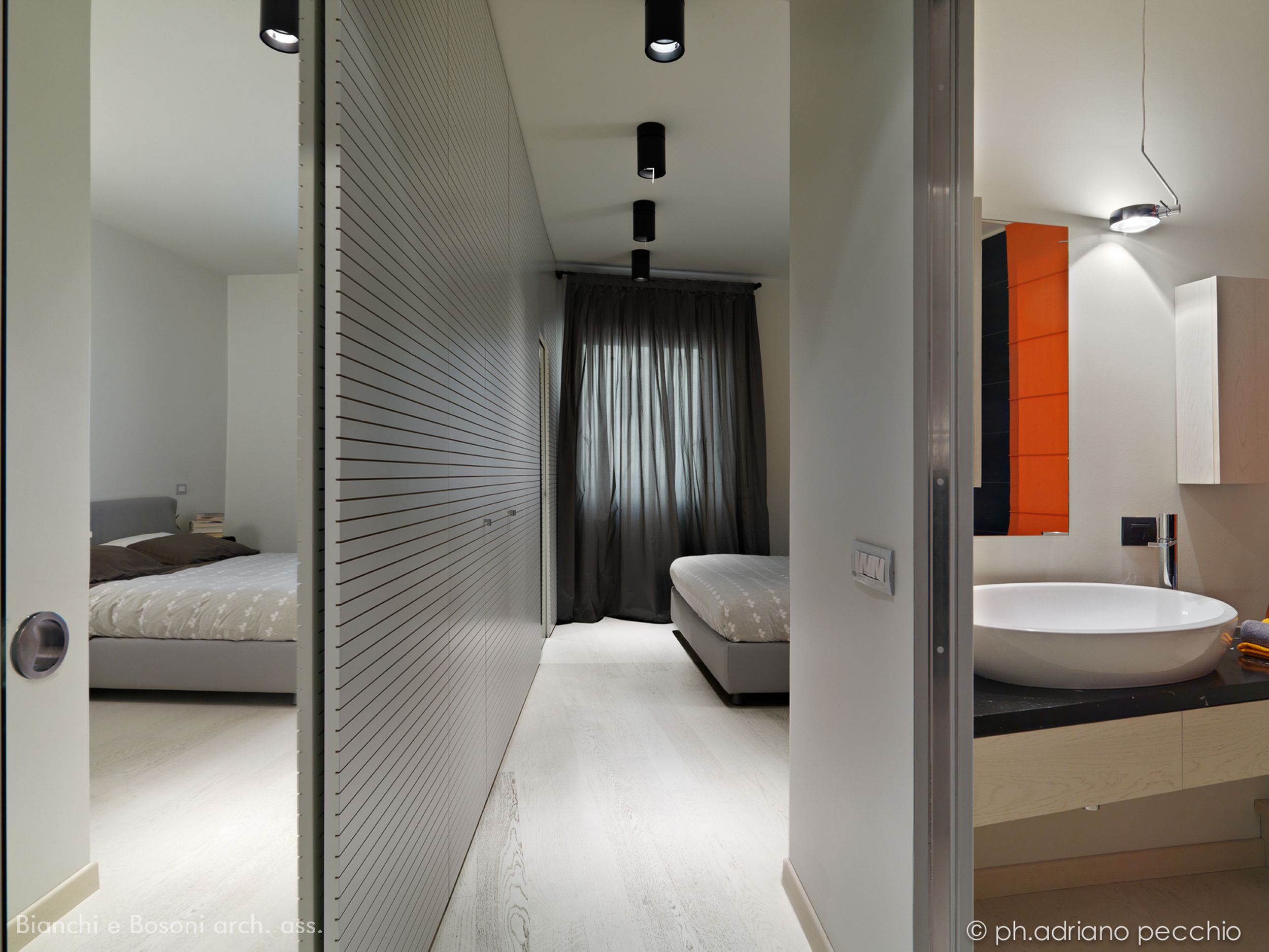 Intervento: Ristrutturazione interna / Superficie: 100 mq / Situazione: Completato / Sintesi del lavoro: Modifica della distribuzione interna e ottimizzazione degli spazi, attraverso la demolizione di tramezze e l’ampliamento della zona giorno. Creazione di secondo bagno e cabina armadio / Radiatori: Anthrax / sanitari: Catalano / lavabo: Antonio Lupi / rubinetteria: Bossini, Fantini / Piano lavabo: Piba marmi / Piatto doccia: Makro / Vasca: Kos / rivestimenti: Mutina, Casa Più, Le Cere / pavimentazione: Margaritelli /porte: Rimadesio, Scrigno essential / Cucina: Veneta cucina / Arredi su misura – progetto: Mobile lavabo in acciaio spazzolato, comodini letto in ferro laccato, bancone snack in ferro laccato e vetro / Impianti: Aspirazione polveri centralizzato – General d’aspirazione