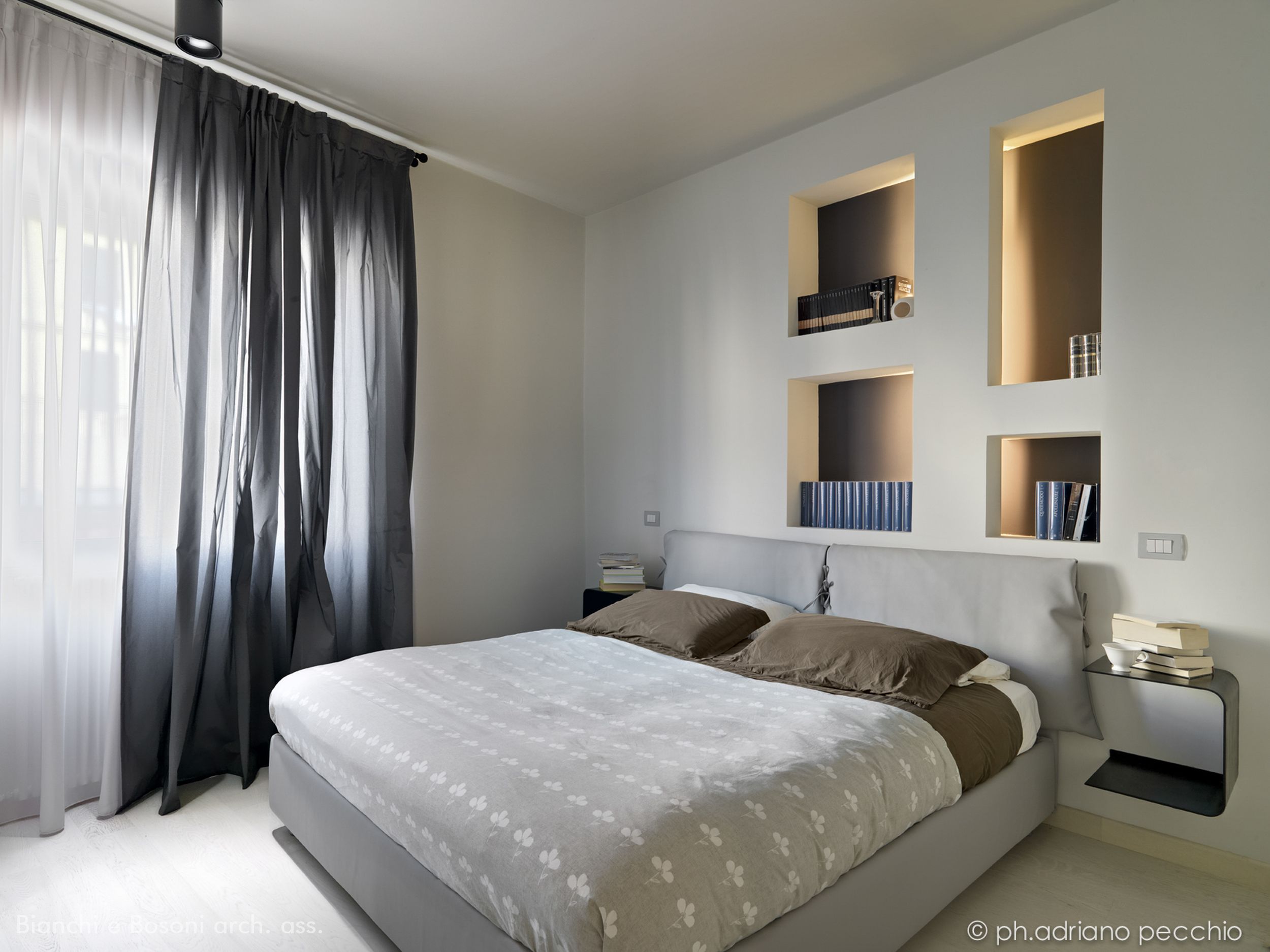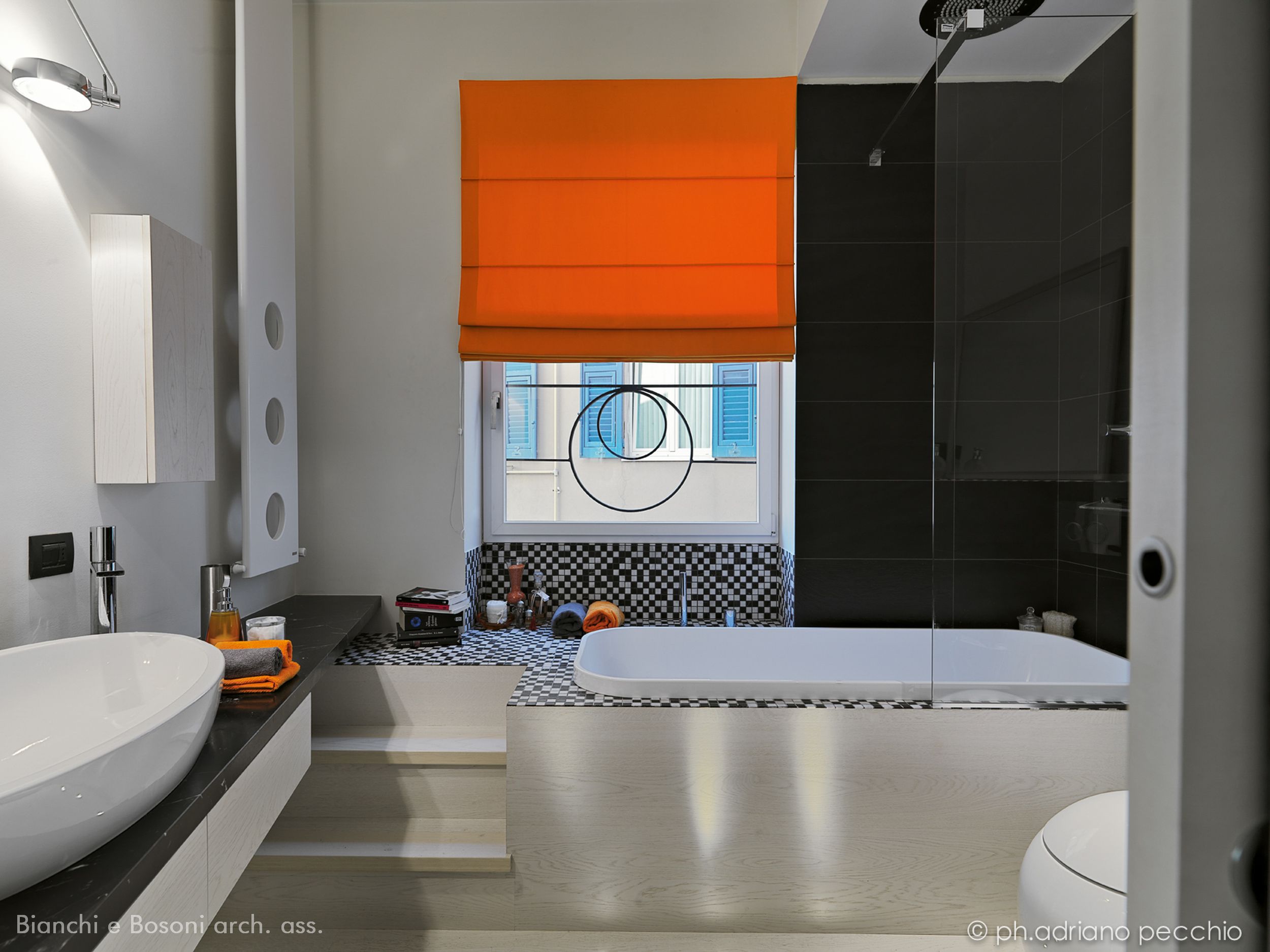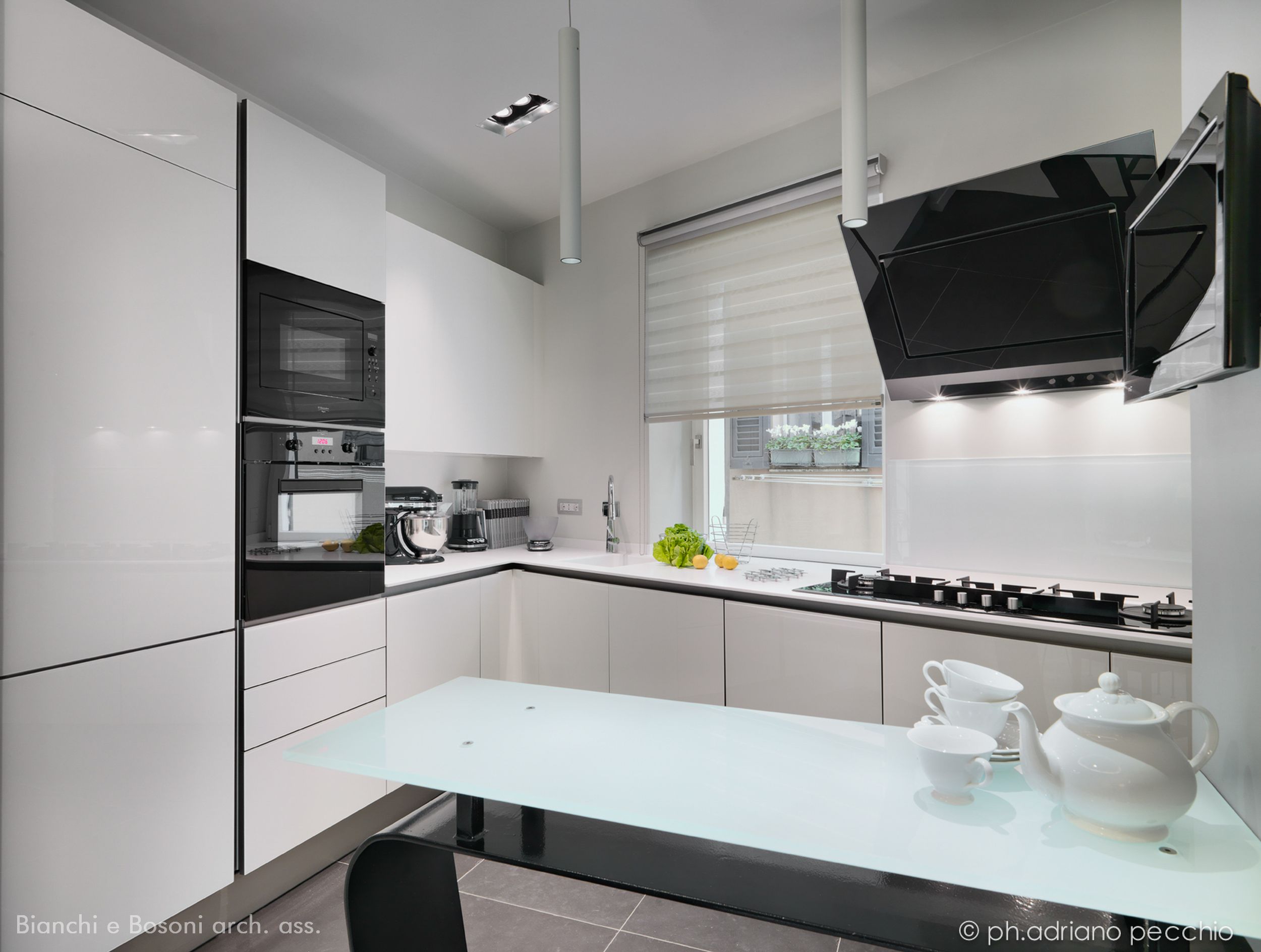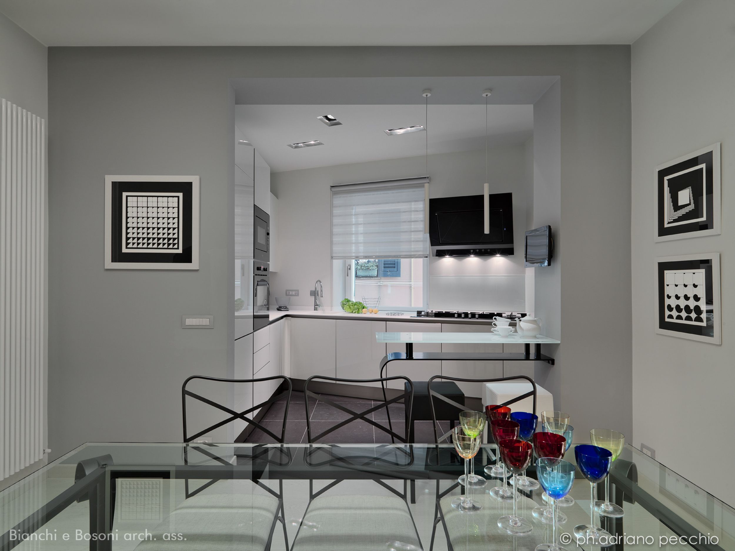 Intervento: Ristrutturazione interna / Superficie: 100 mq / Situazione: Completato / Sintesi del lavoro: Modifica della distribuzione interna e ottimizzazione degli spazi, attraverso la demolizione di tramezze e l’ampliamento della zona giorno. Creazione di secondo bagno e cabina armadio / Radiatori: Anthrax / sanitari: Catalano / lavabo: Antonio Lupi / rubinetteria: Bossini, Fantini / Piano lavabo: Piba marmi / Piatto doccia: Makro / Vasca: Kos / rivestimenti: Mutina, Casa Più, Le Cere / pavimentazione: Margaritelli /porte: Rimadesio, Scrigno essential / Cucina: Veneta cucina / Arredi su misura – progetto: Mobile lavabo in acciaio spazzolato, comodini letto in ferro laccato, bancone snack in ferro laccato e vetro / Impianti: Aspirazione polveri centralizzato – General d’aspirazione