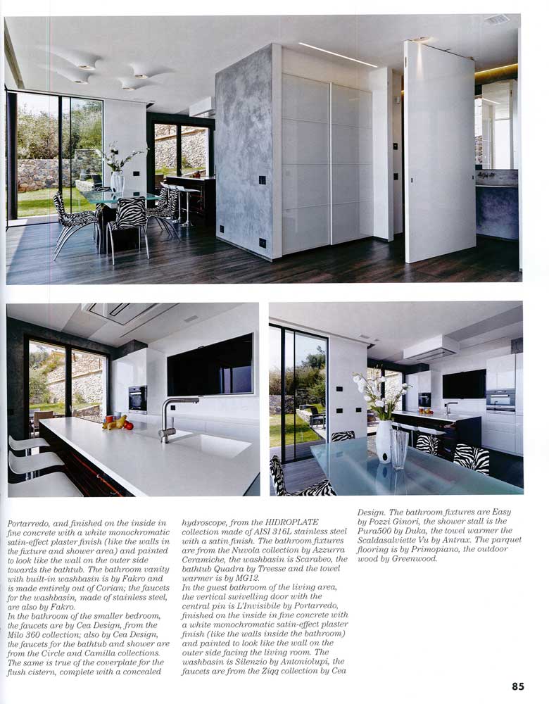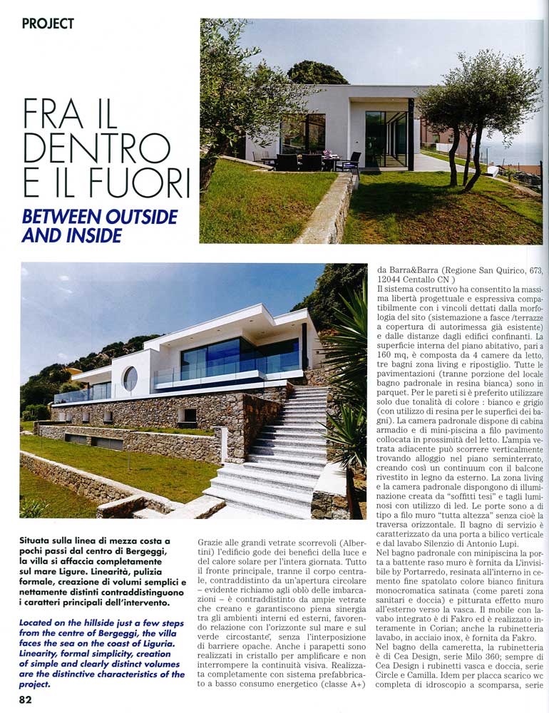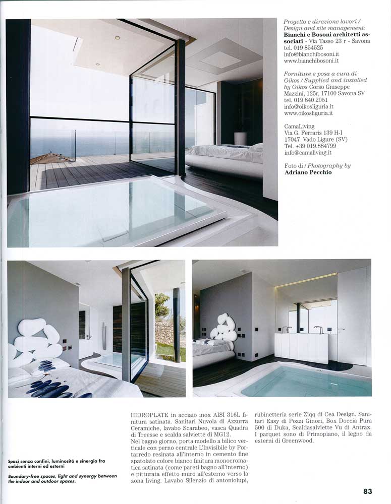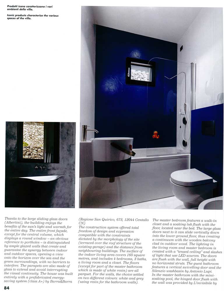 <<Grazie alle grandi vetrate scorrevoli (Albertini) l’edificio gode dei benefici della luce e del calore solare per l’intera giornata. Tutto il fronte principale, tranne il corpo centrale, contraddistinto da un’apertura circolare – evidente richiamo agli oblò delle imbarcazioni- è contraddistinto da ampie vetrate creano e garantiscono piena sinergia tra gli ambienti interni ed esterni, favorendo relazione con l’orizzonte sul mare e sul verde circostante (….) >>