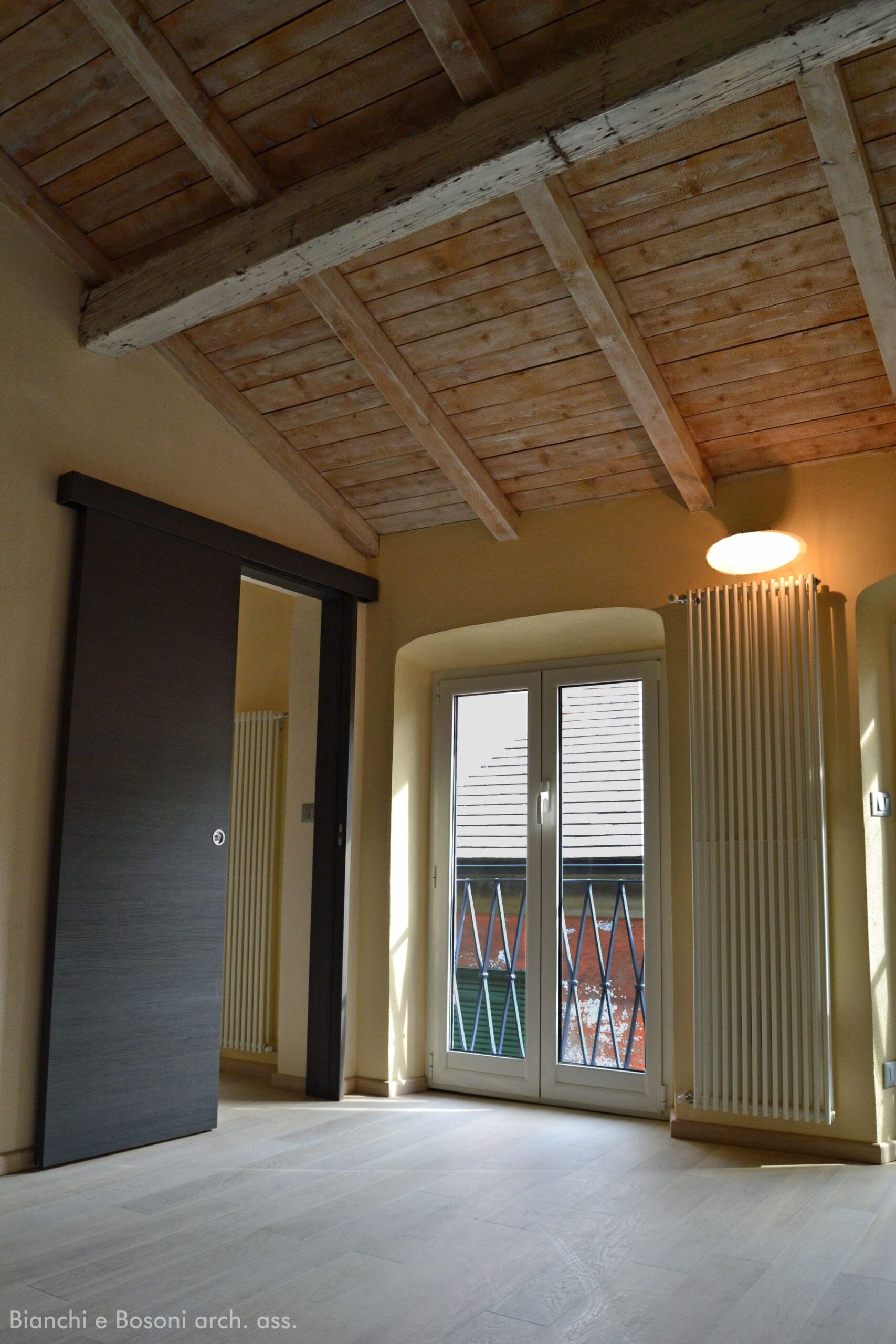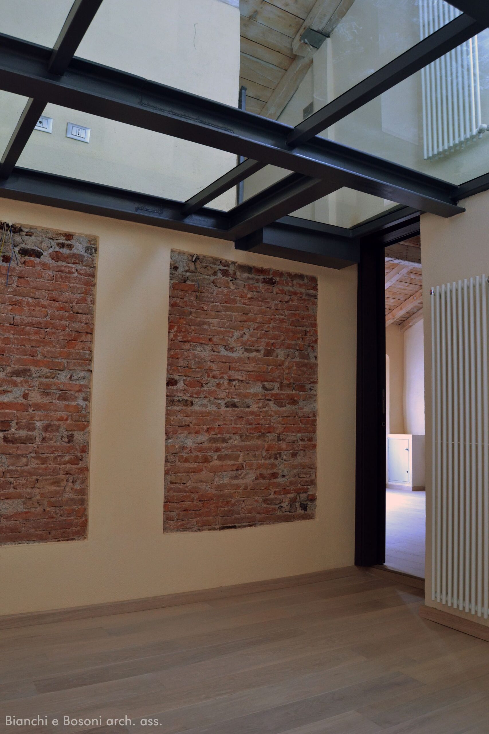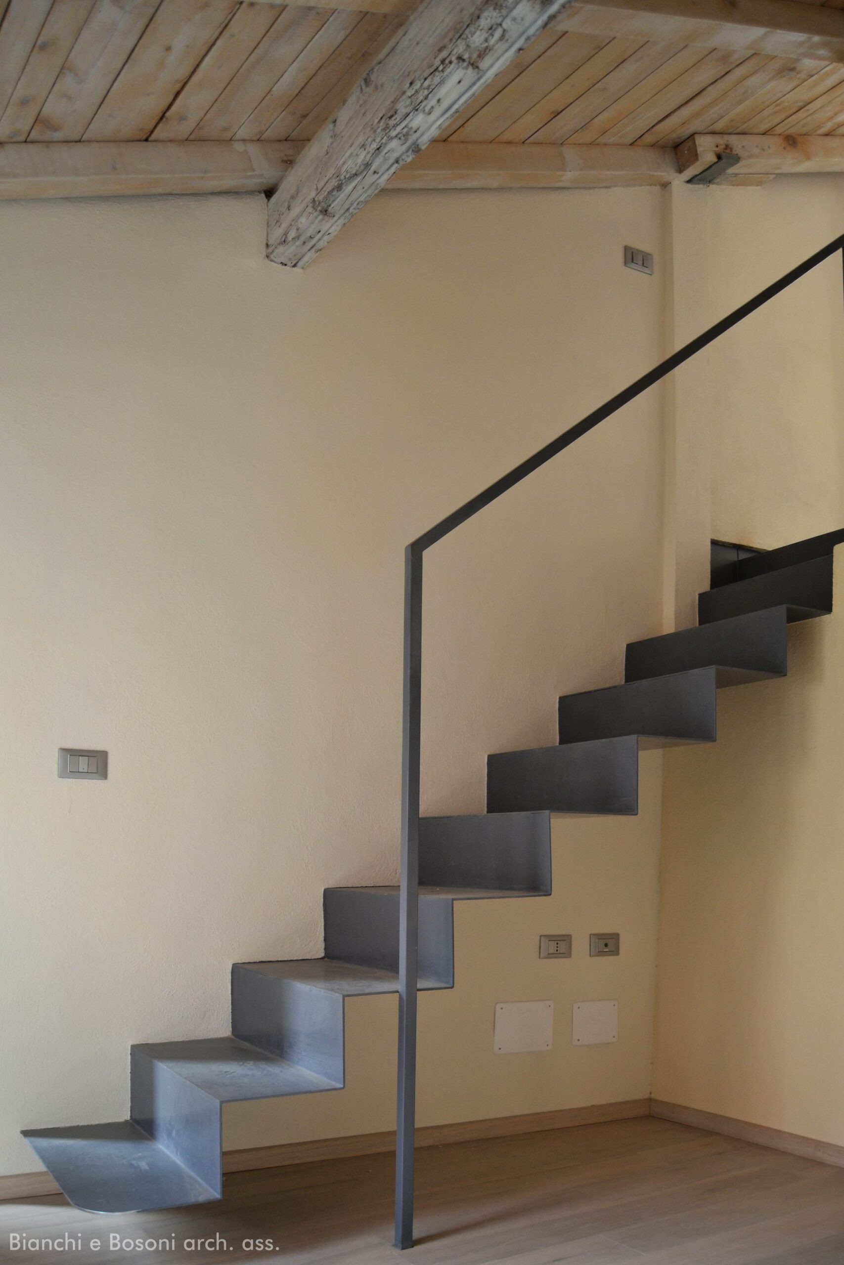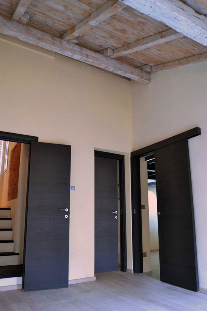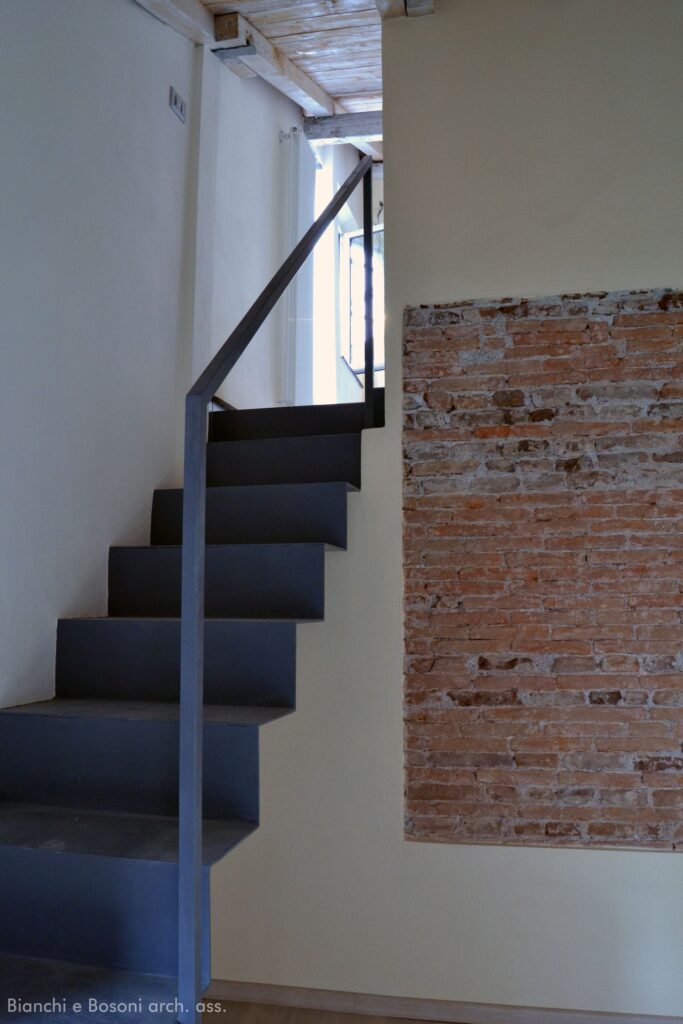 Intervento: Ristrutturazione interna e creazione di soppalco in vetro / Superficie: 40 + 10 mq / Situazione: Completato / Sintesi del lavoro: Diversa distribuzione interna e ottimizzazione degli spazi, con creazione di soppalco in metallo e vetro / Radiatori: Irsap / sanitari: Globo / Rubinetteria: PozziGinori, Linea Beta / Pavimentazione: parquet Margaritelli / Arredi su misura/progetto: Scala a sbalzo in lamiera di ferro verniciato – Soppalco in vetro calpestabile
